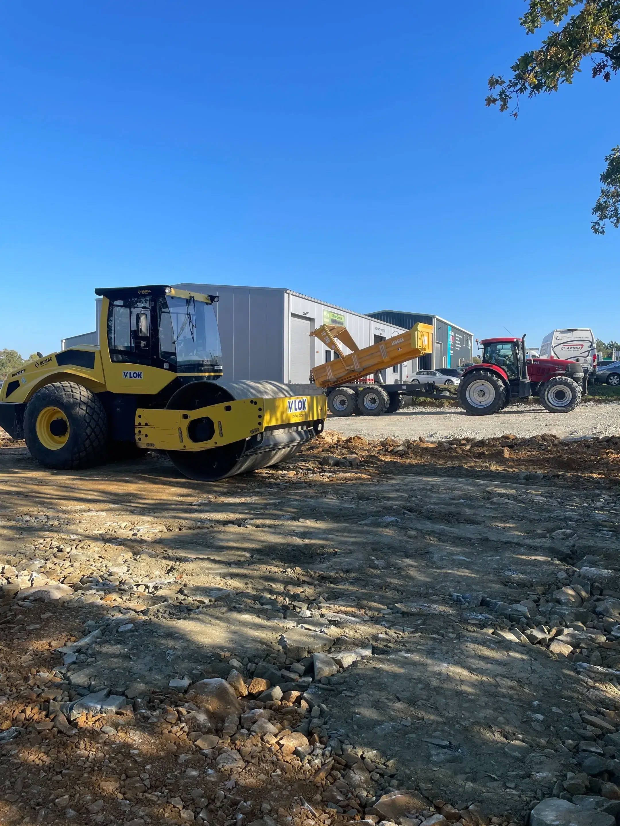 Renforcement du sol grâce à des matériaux de carrière afin d’assurer une base solide et durable.